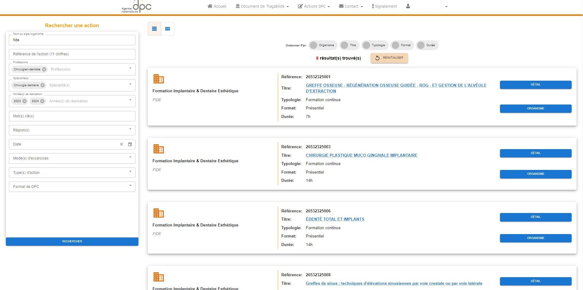 J’accède à la recherche des actions DPC en tapant FIDE